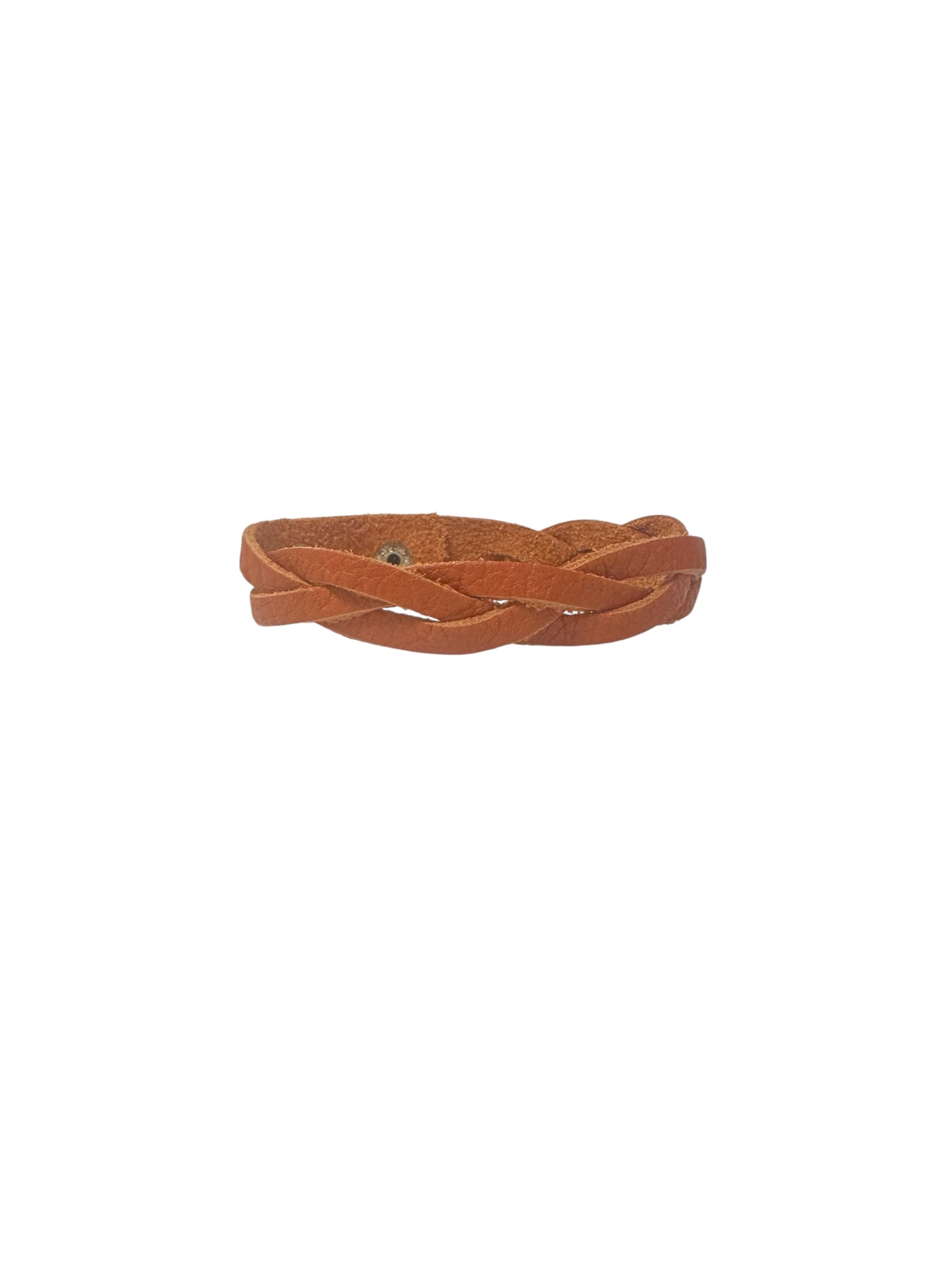 A bold bracelet, made of genuine braided leather in a rich orange tone, blending rustic charm with contemporary edge.