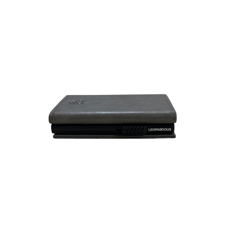 This compact cardholder is crafted from premium leather and features an aluminum pop-up card case that securely holds up to 5 cards. Thoughtful details include additional slots for cash and extra cards, along with a discreet external zip pocket for small essentials. Built-in RFID blocking provides added protection for your cards.
